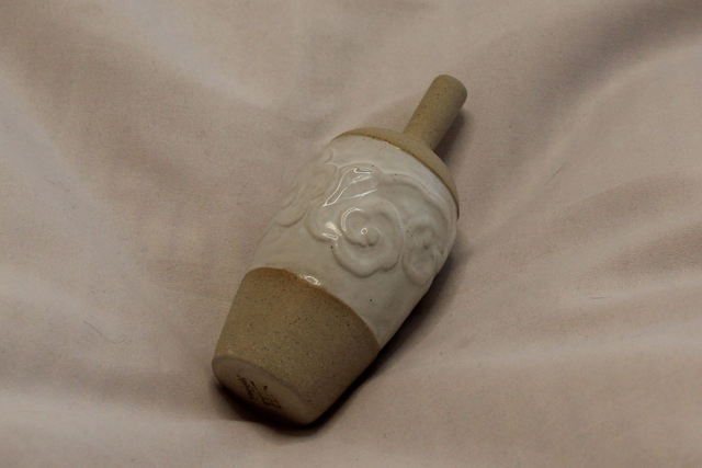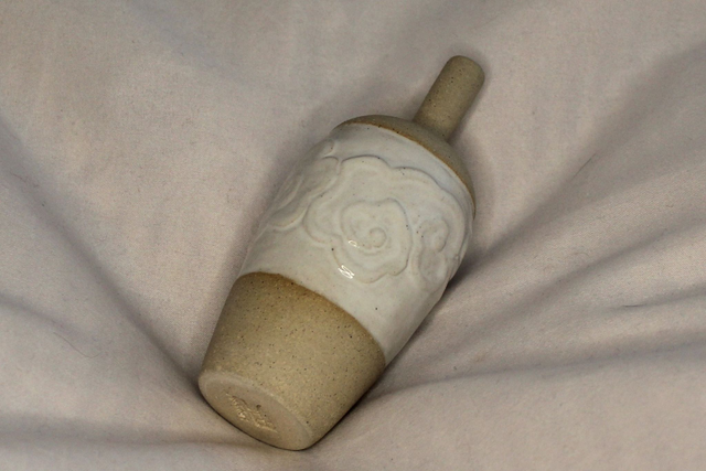This is a small bud vase inspired by the quiet movement and layering of clouds. A soft band of raised, swirling forms wraps the centre of the piece, evoking drifting cloud banks seen from above. These gentle relief patterns emerge through a pale, gloss glaze, creating depth through shadow rather than colour.