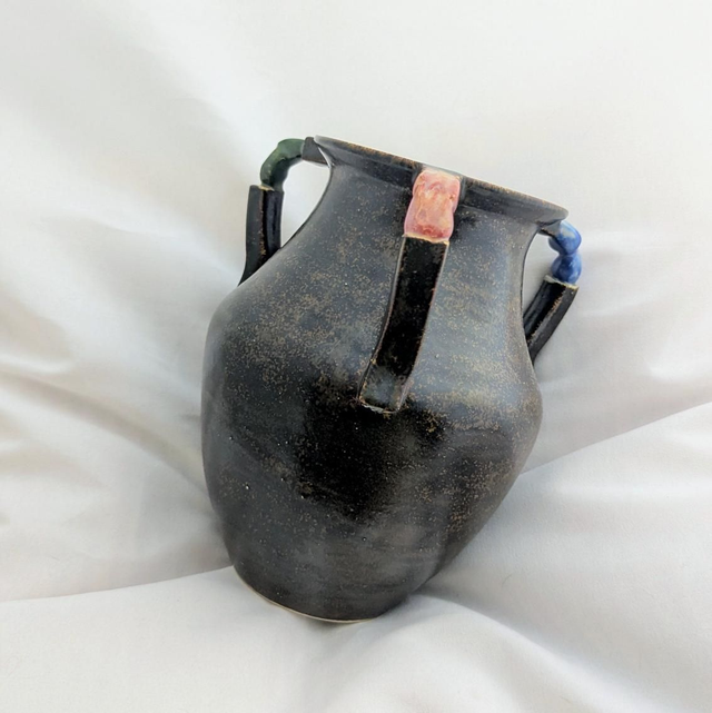 Three vertical handles adorn the vessel, each carved and glazed in hues